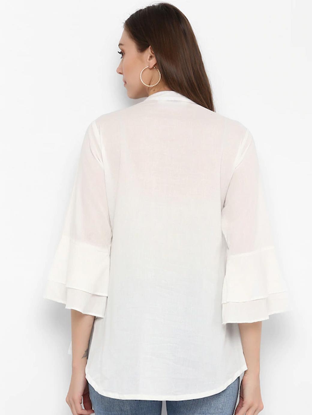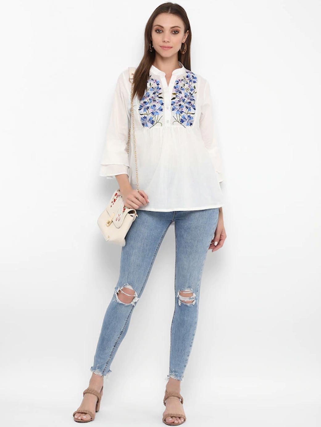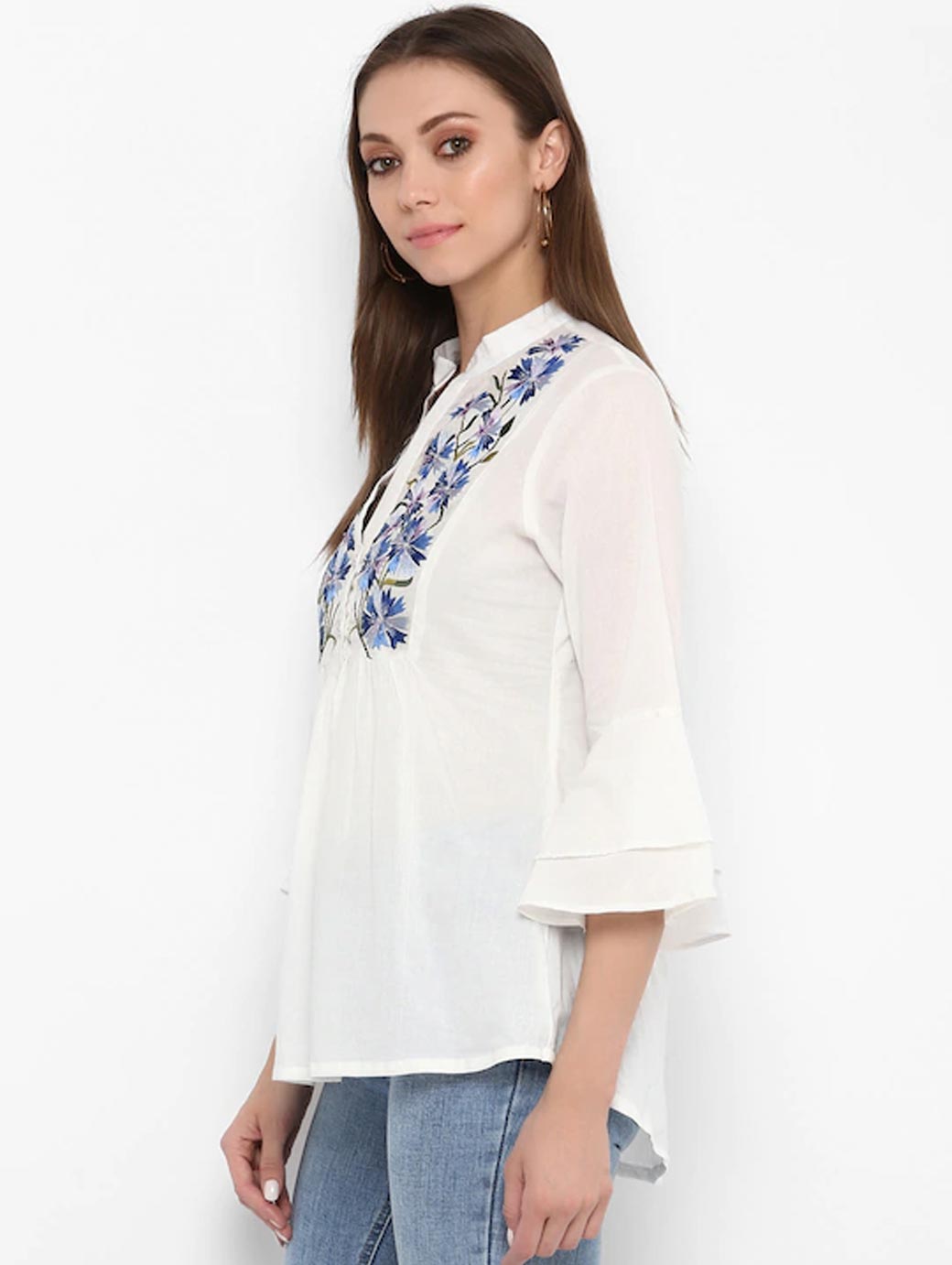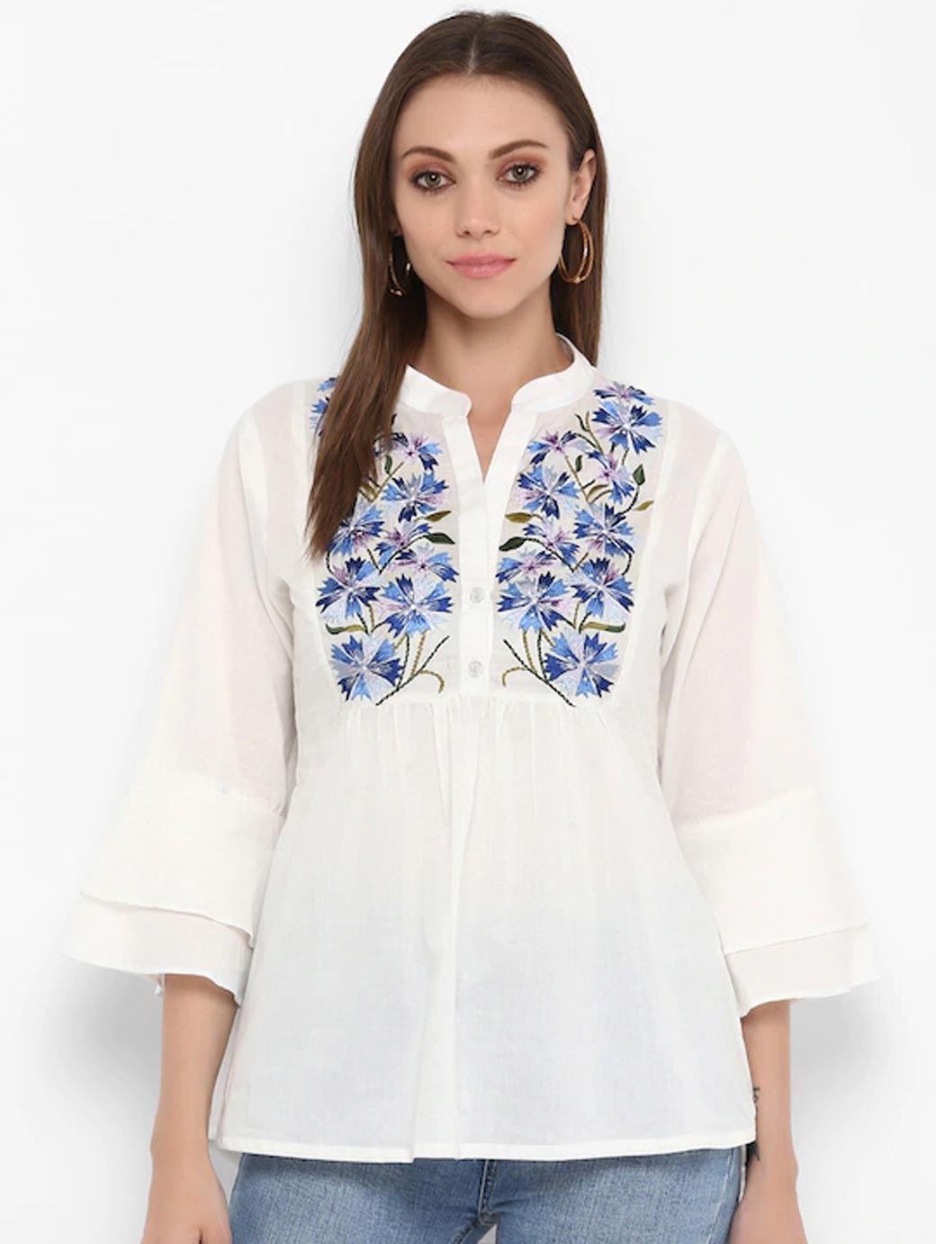 White and blue printed woven regular top, has a mandarin collar, three-quarter sleeves, button closure.