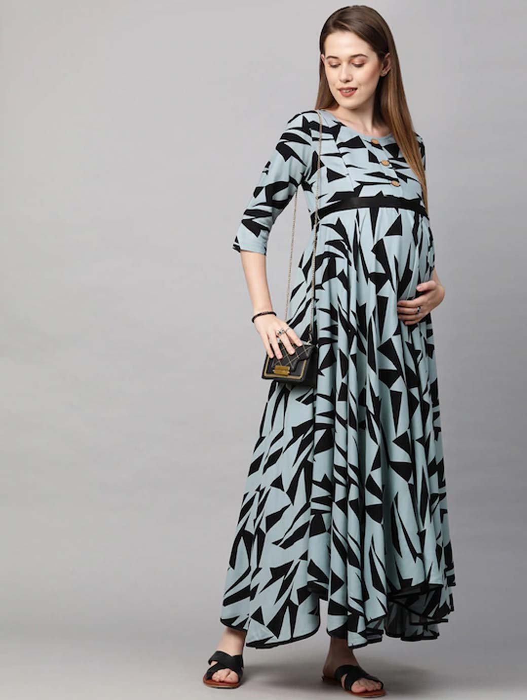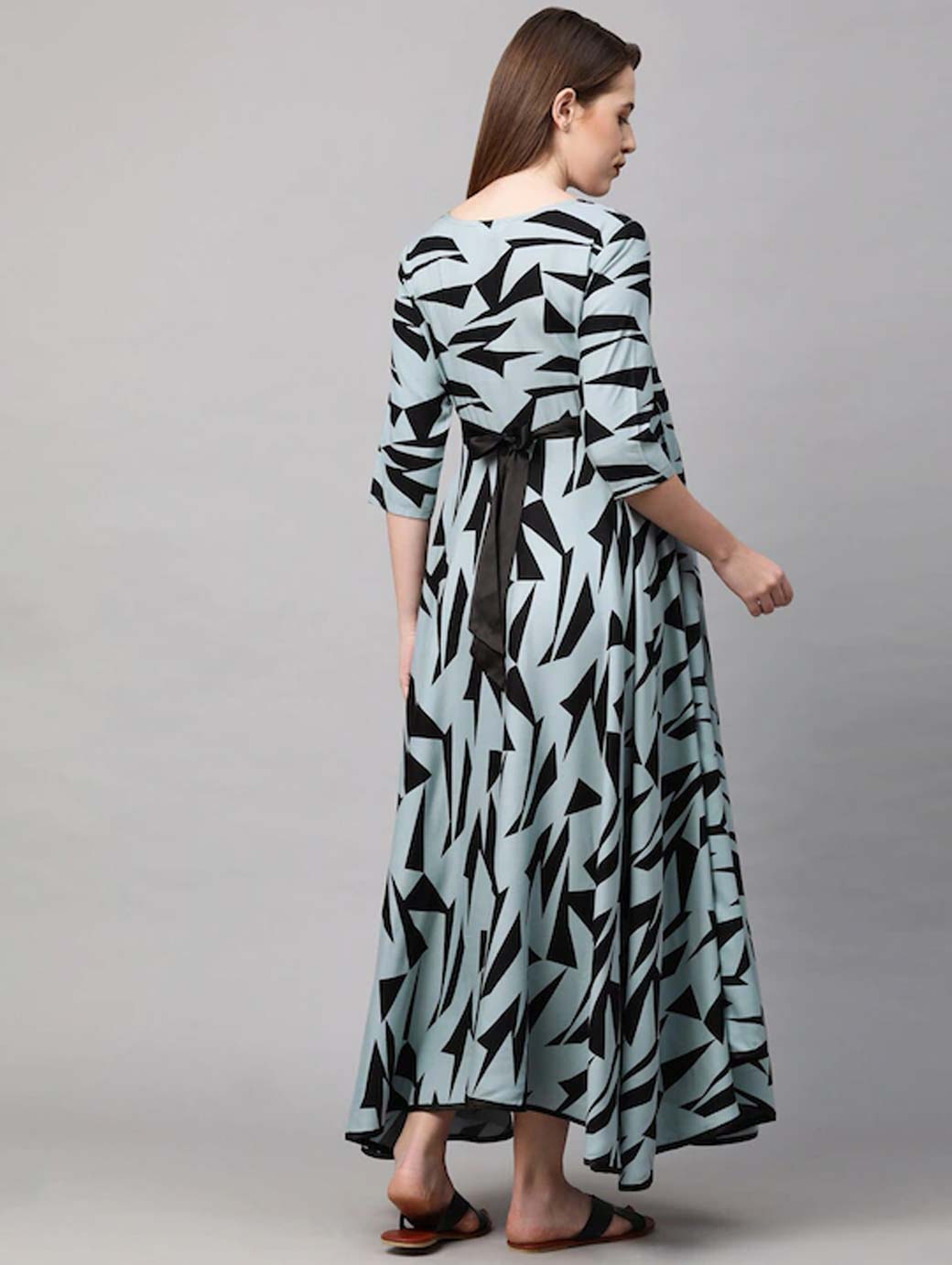 Grey and black geometric print maxi dress Round neck Three-quarter, regular sleeves Maxi length in flared hem Concealed zip closure