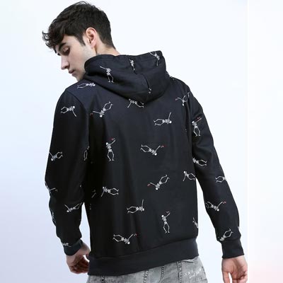 Black printed sweatshirt has a hooded, 2 kangaroo pocket pockets, long sleeves, closure, straight hem