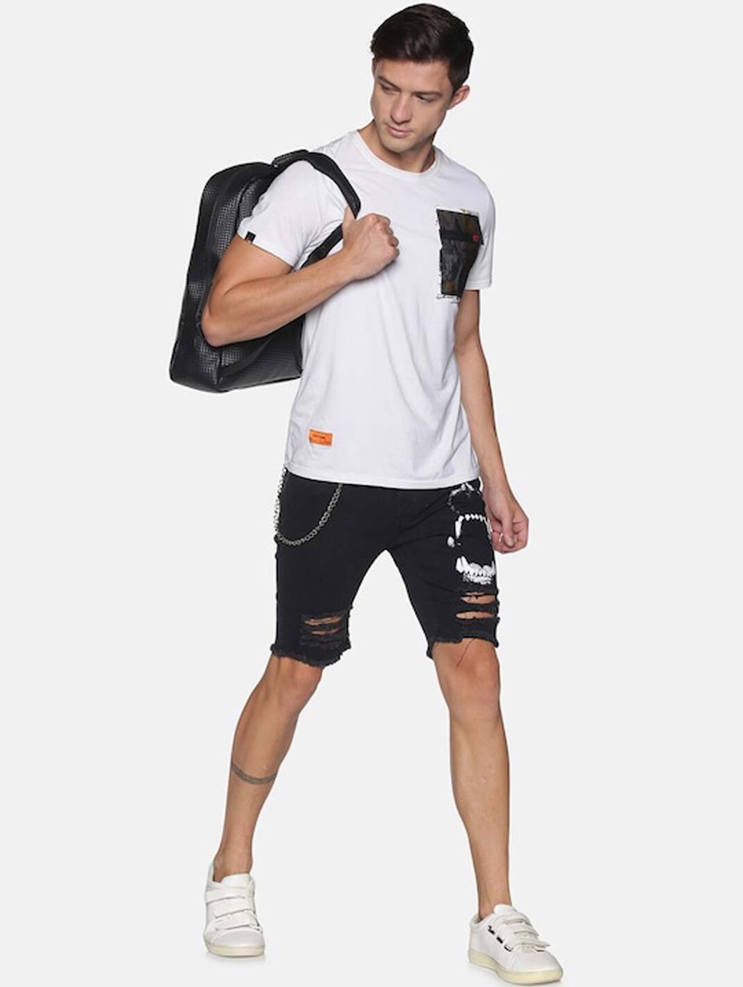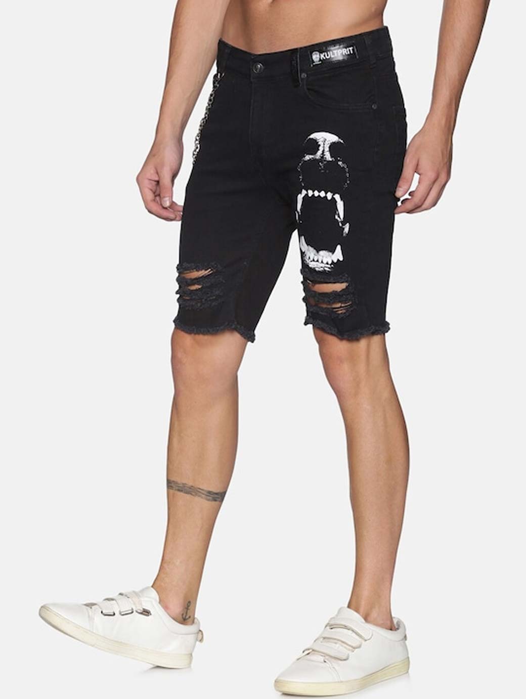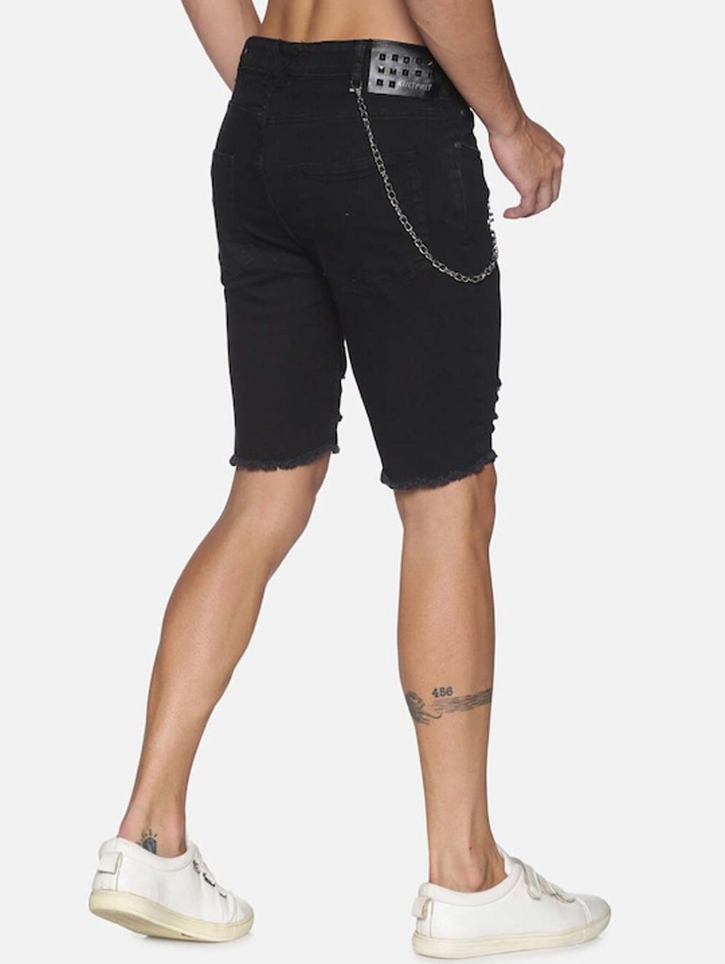 Black solid mid-rise denim shorts, has 5 pockets, button closure