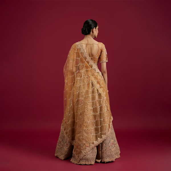 Turn heads with the Mustard Yellow Radiance Lehenga, resplendent in a vibrant tint and enriched with intricate designs. Woven in luxurious net fabric, it comes with matching dupatta, bridal petticoat, latkan and belt to accentuate your elegance. Perfect for sumptuous weddings and grand celebrations.