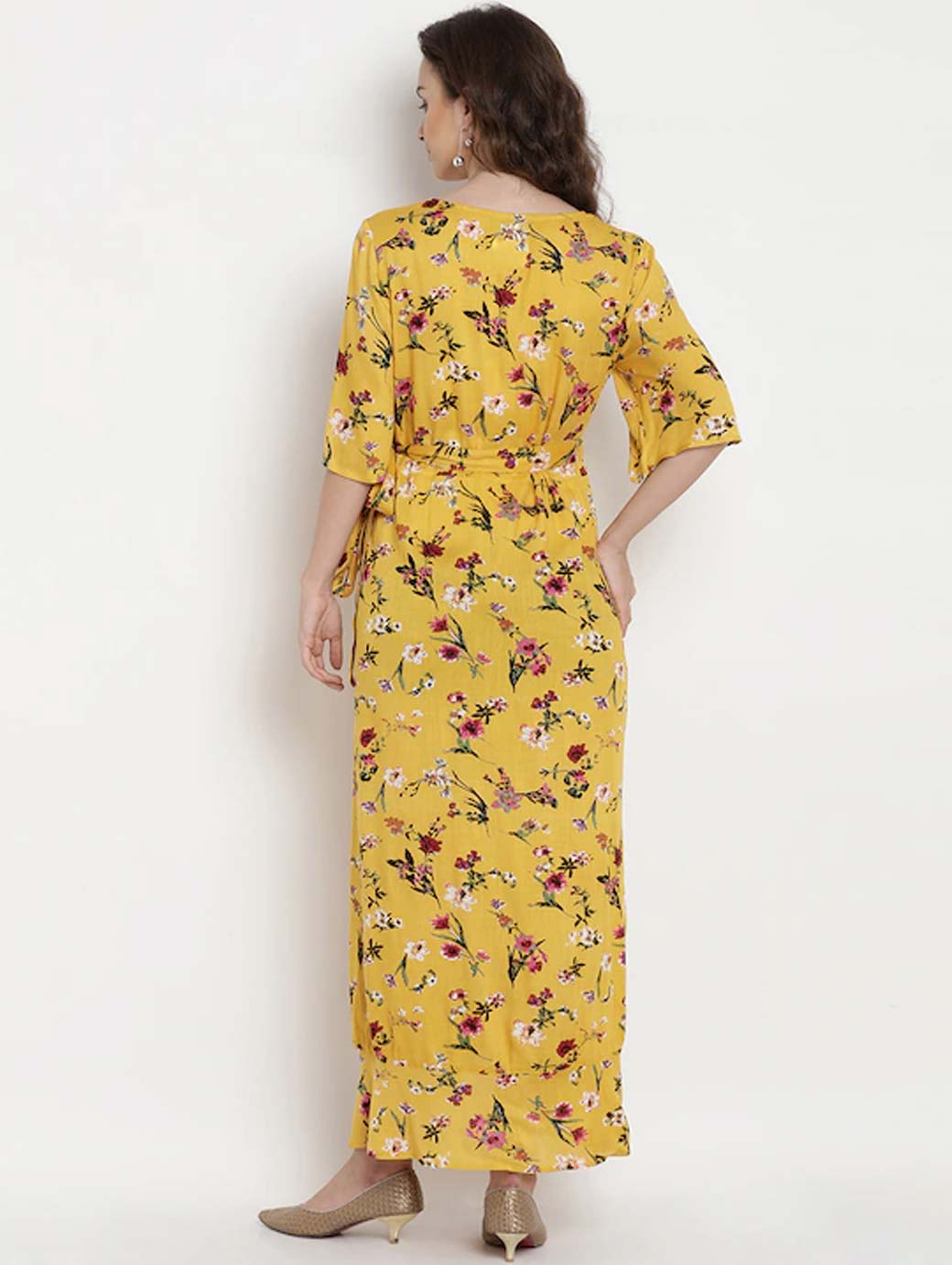 Yellow printed woven maternity wrap dress, has a V-neck, short sleeves, and tulip hem