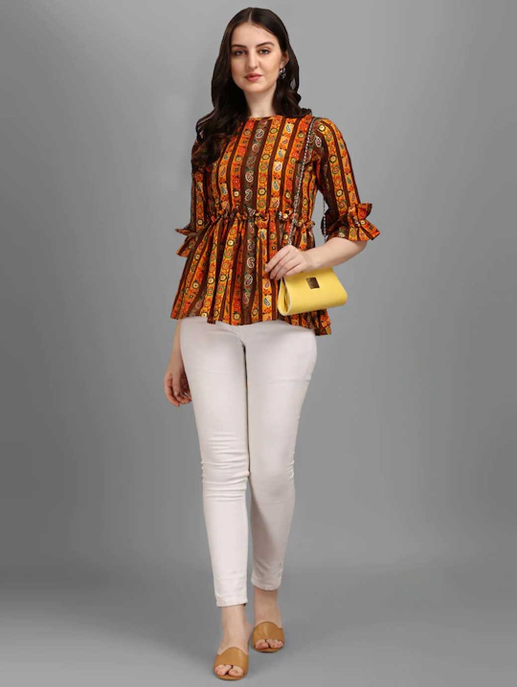 Yellow and brown regular cinched waist top, Ethnic motifs print, Boat neck, short, bell sleeve sleeves, Knitted.