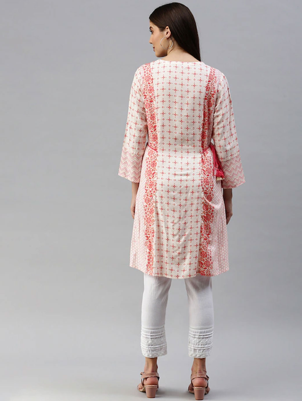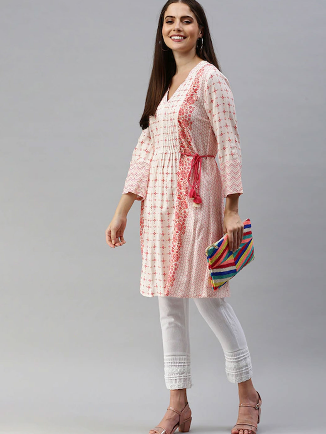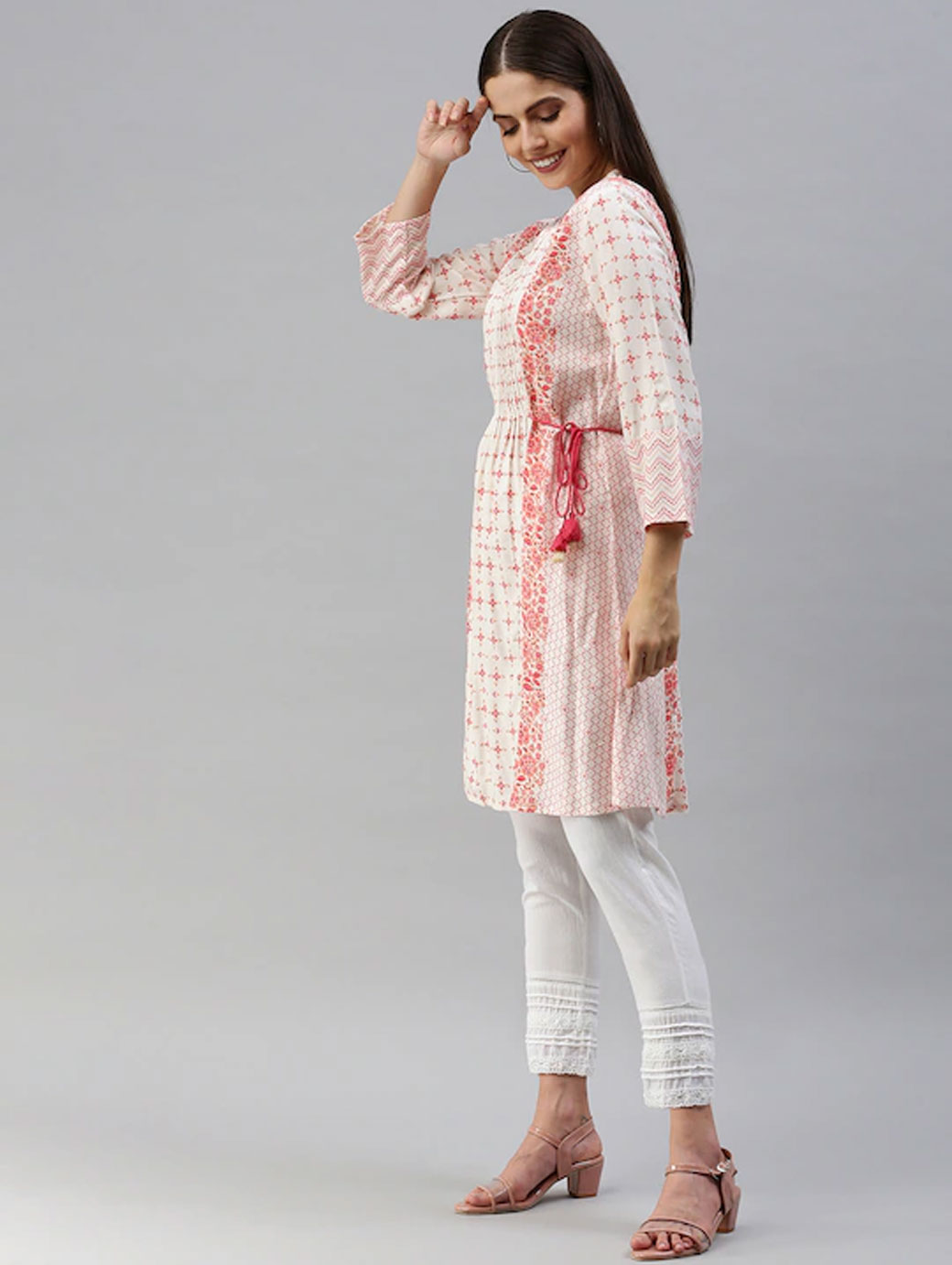 Off white and pink printed tunic, has a v-neck, three-quarter sleeves.