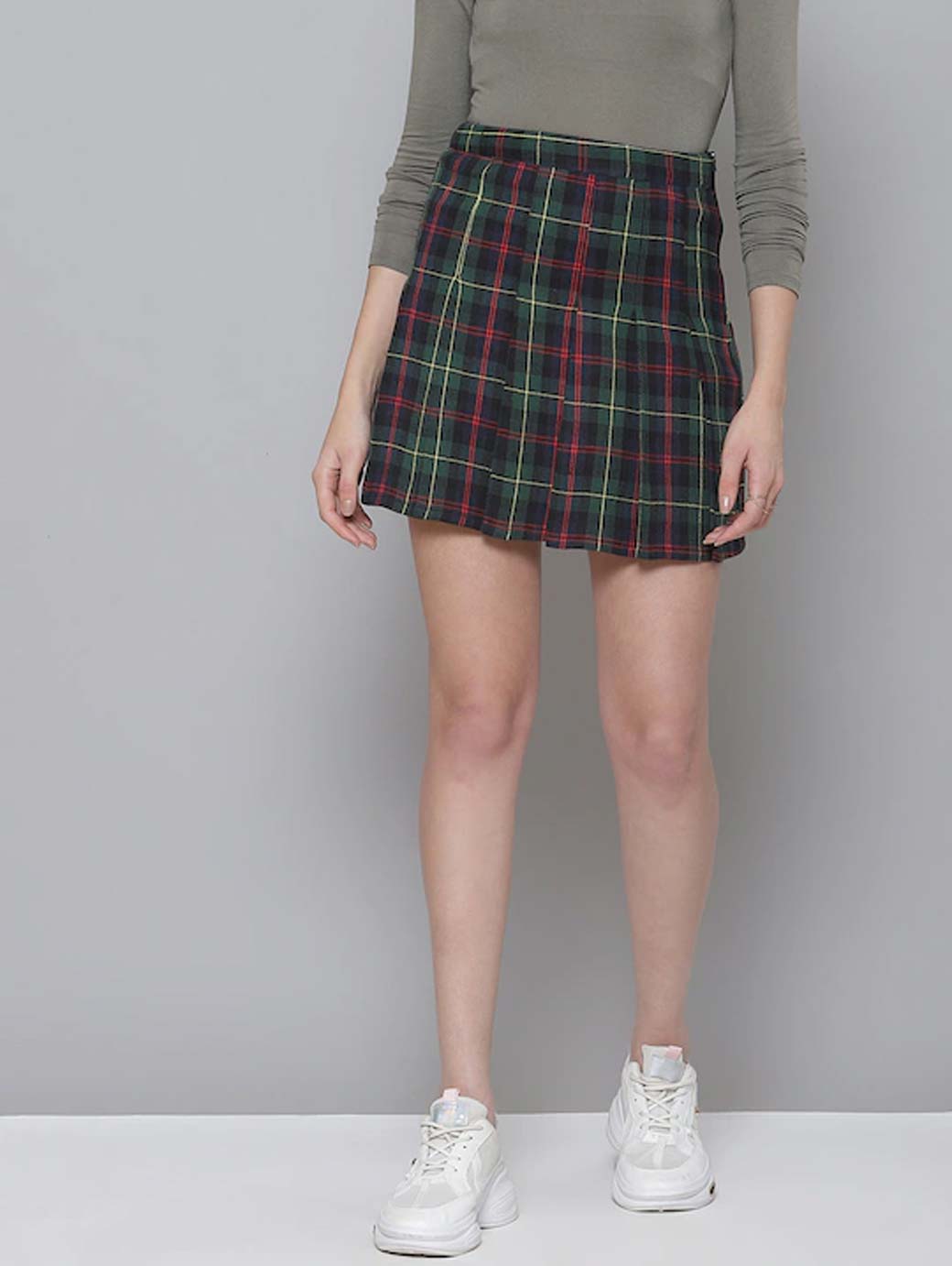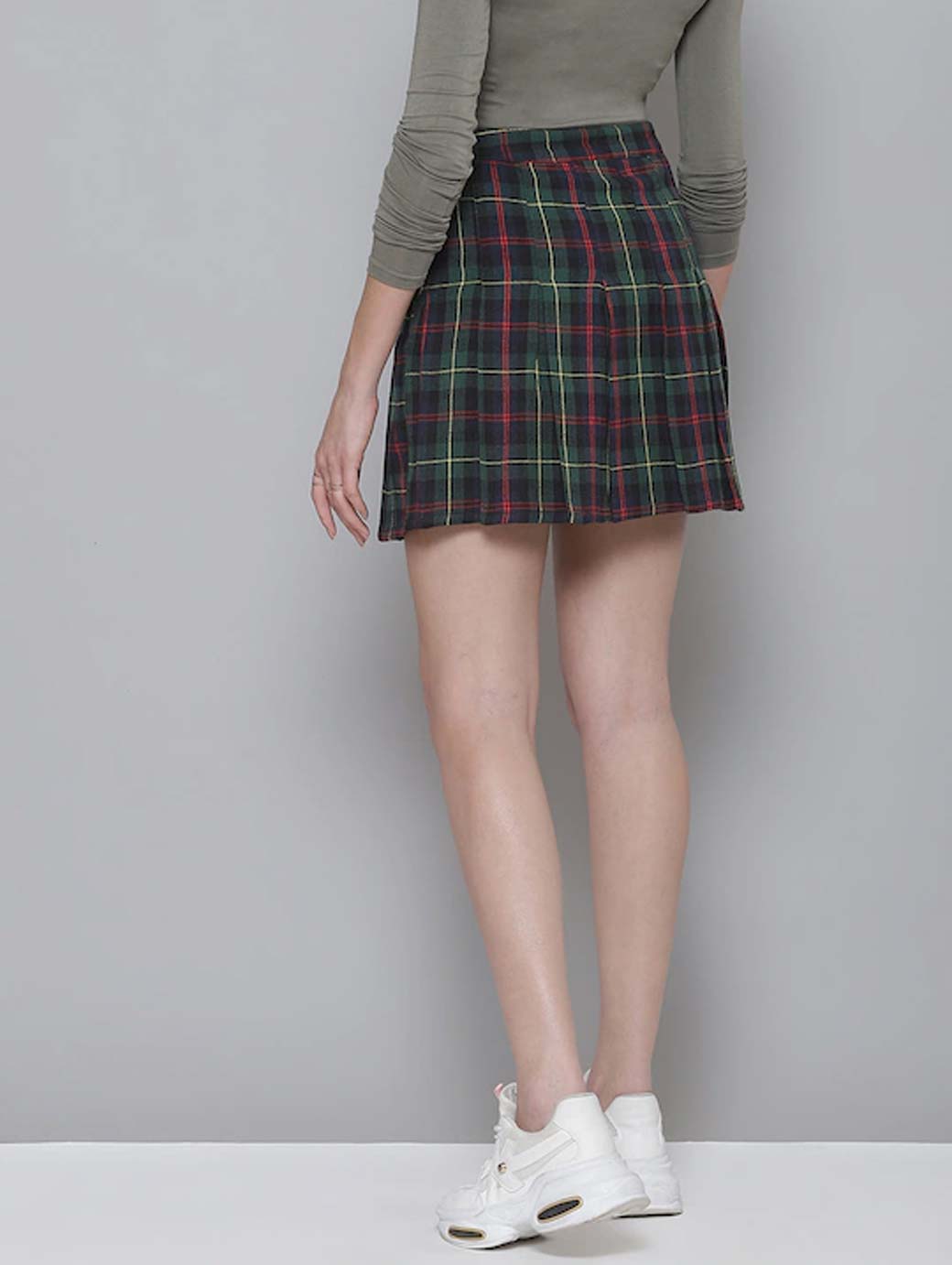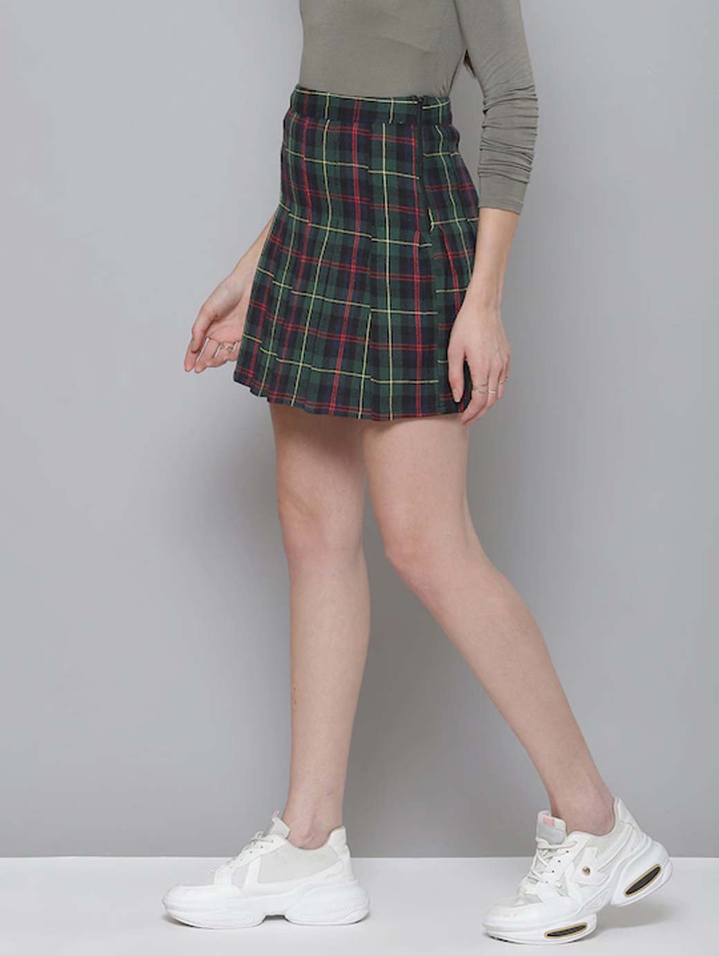 Green and navy blue checked A-line skirt with pleated detail, has a waistband, a zip closure on the side, flared hem