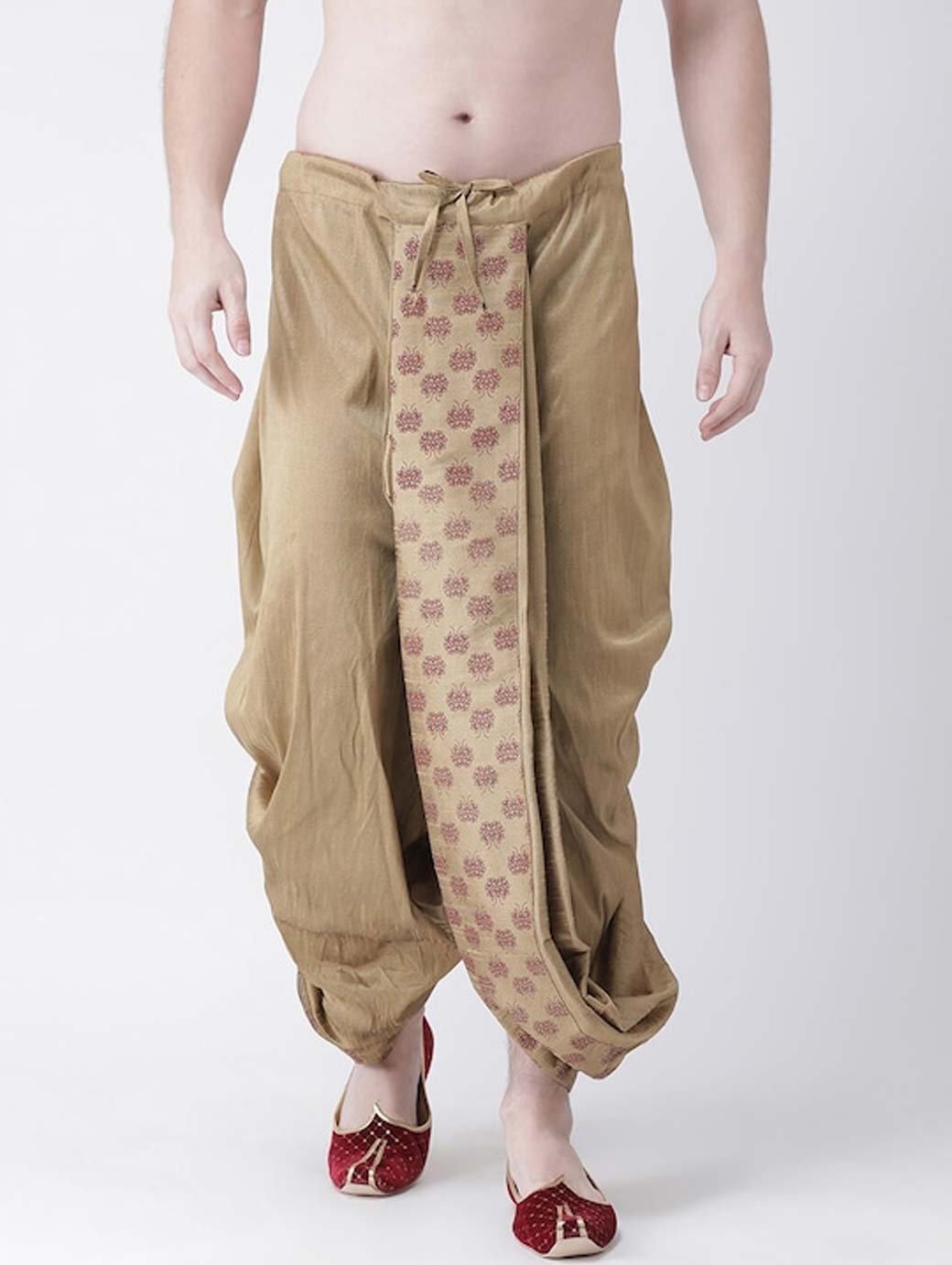 Beige and maroon printed regular-fit dhotis, with gathered and pleated detail, has a waistband with a drawstring fastening Disclaimer: Product color may slightly vary due to photographic lighting sources or your monitor settings
