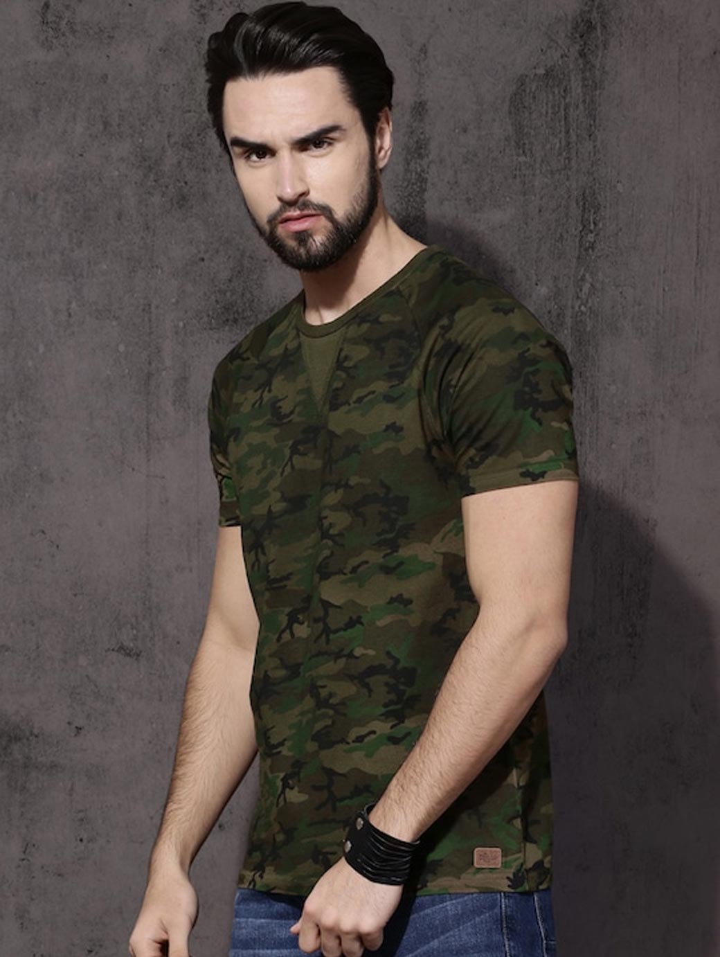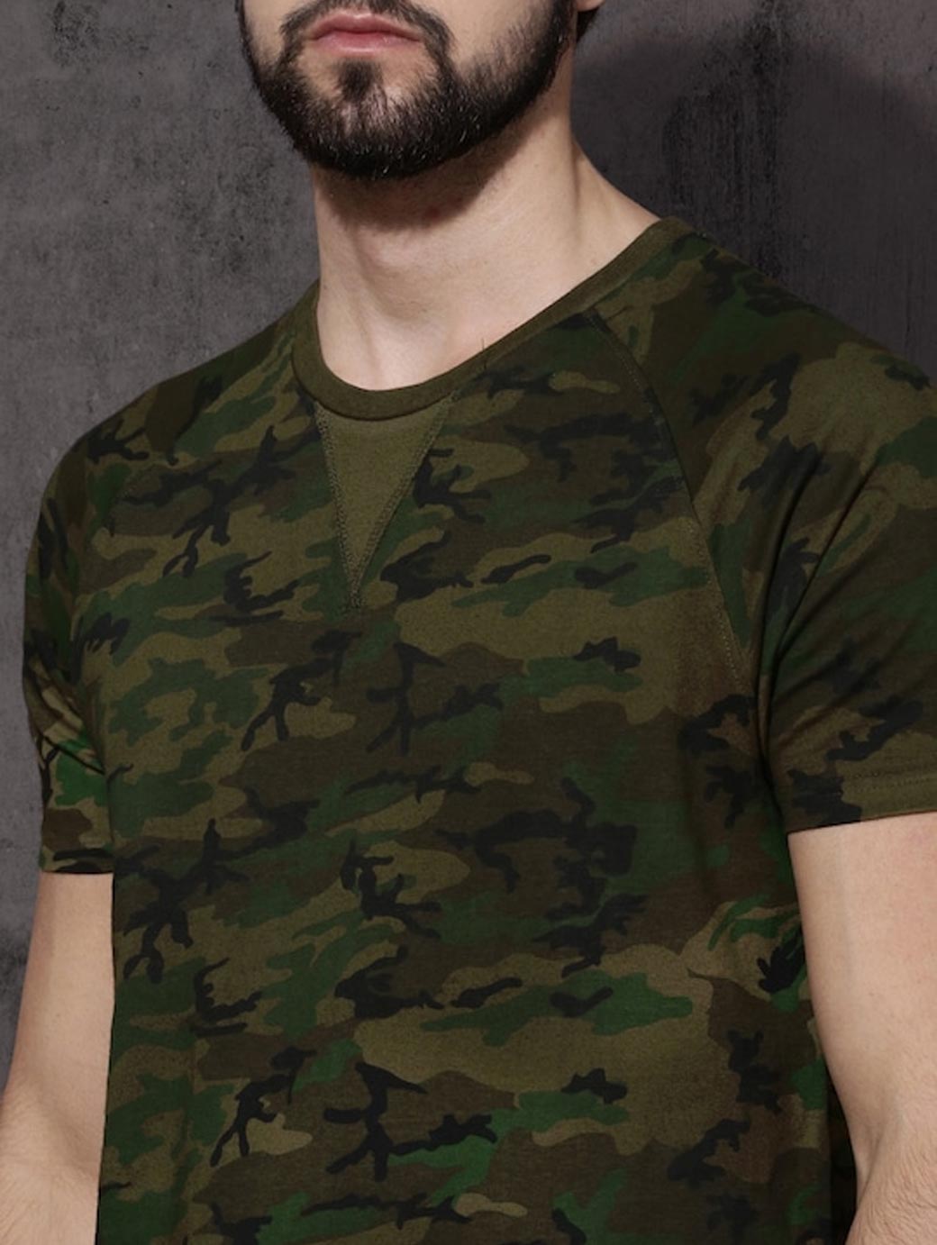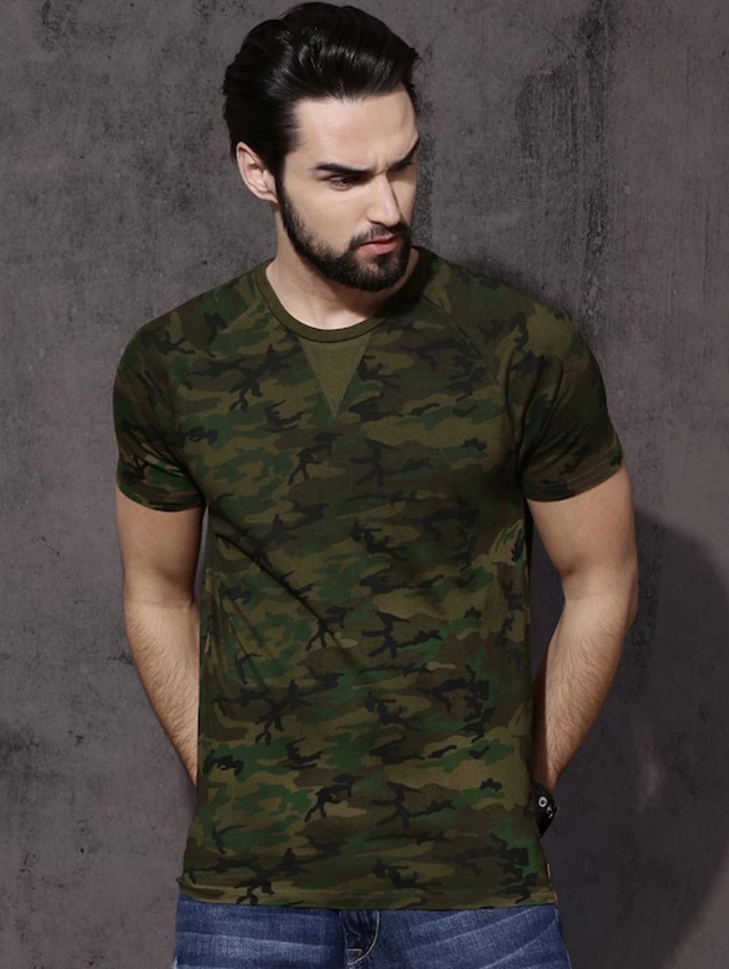 Olive Green printed T-shirt, has a round neck, short sleeves