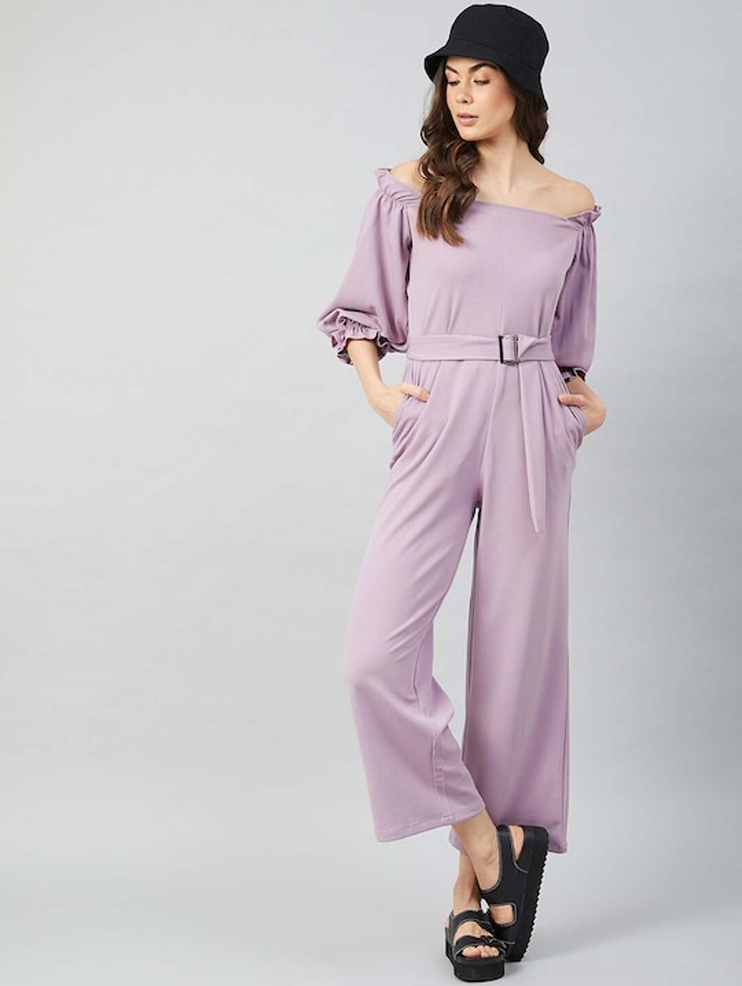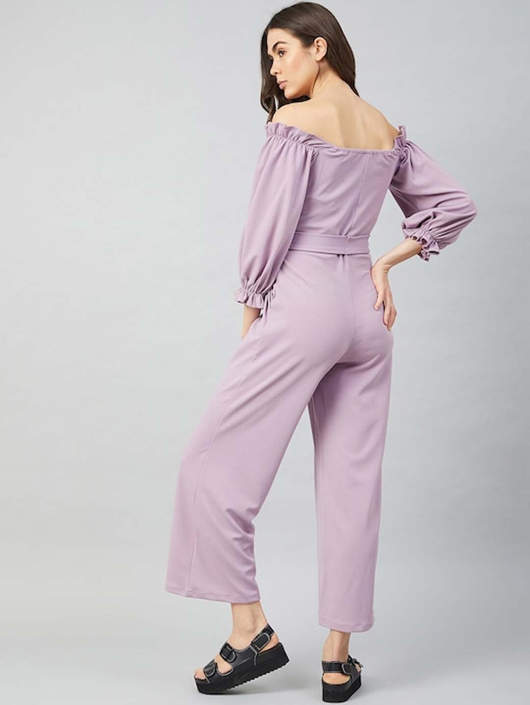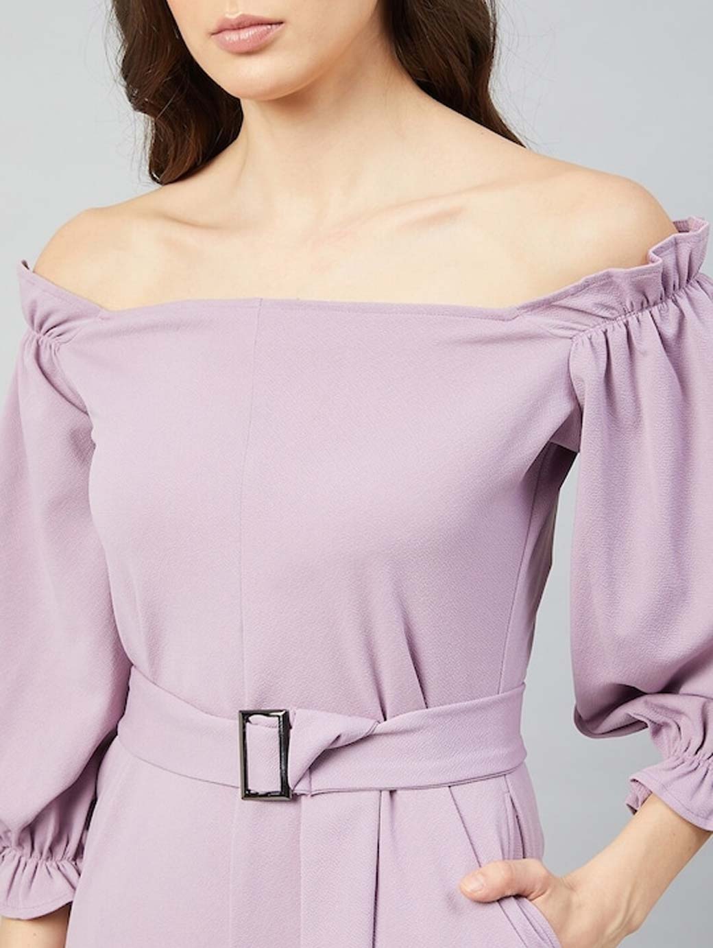 Lavender solid basic jumpsuit, has a off-shoulder, front tie-up, three-quarter sleeves