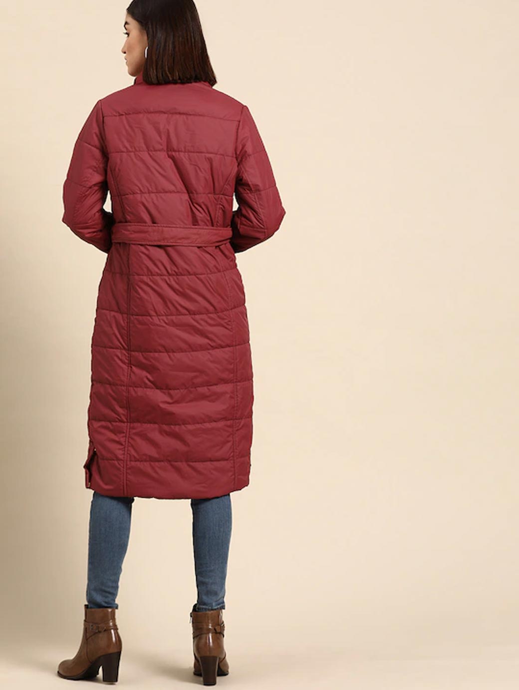 Maroon solid longline parka jacket with faux fur trim, has a detachable hood, 3 pockets ,has a snap button and zip closure, long sleeves, straight hemline, polyester lining Comes with a belt