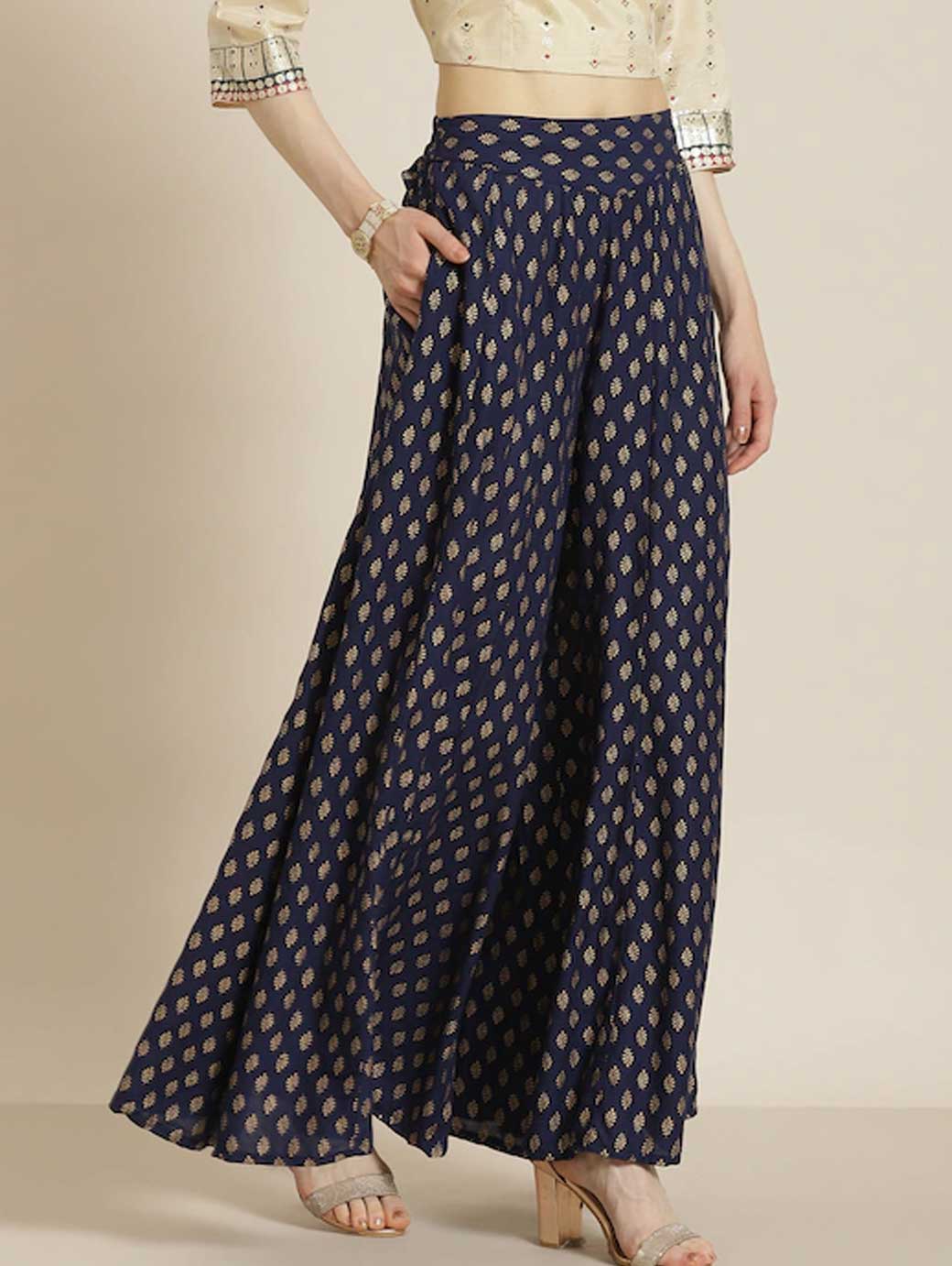 Women Navy Blue & Golden Ethnic Motifs Printed Flared Palazzos